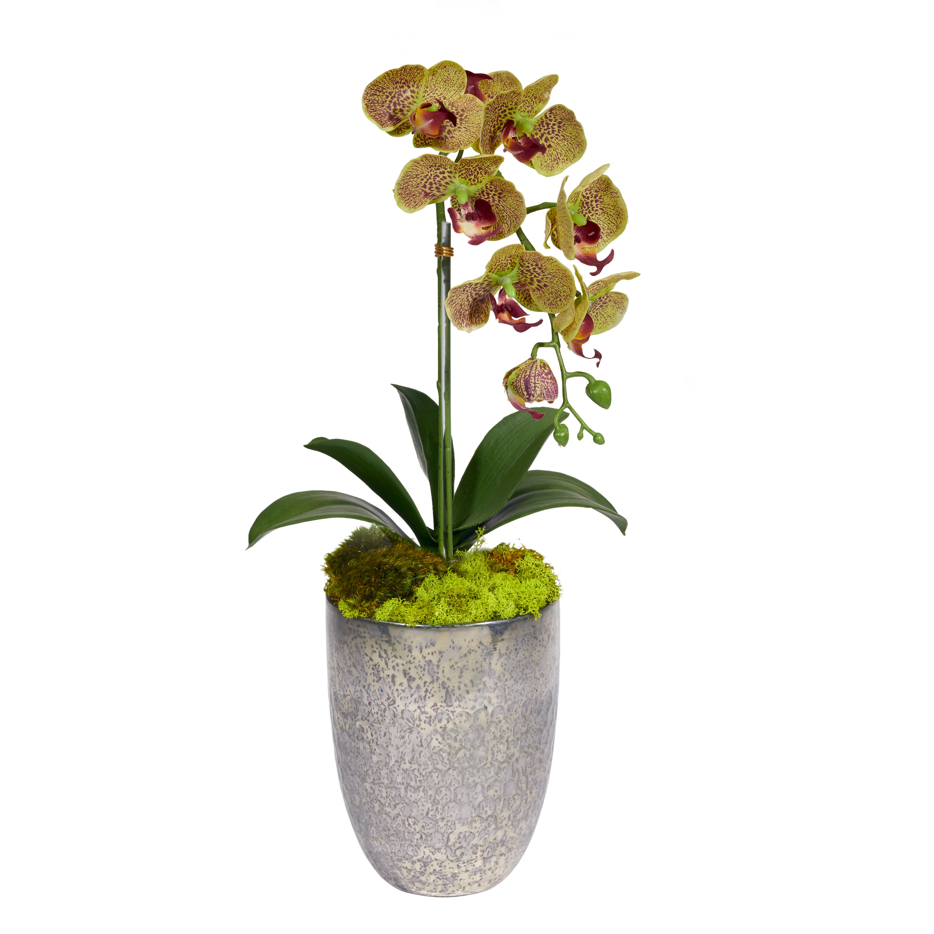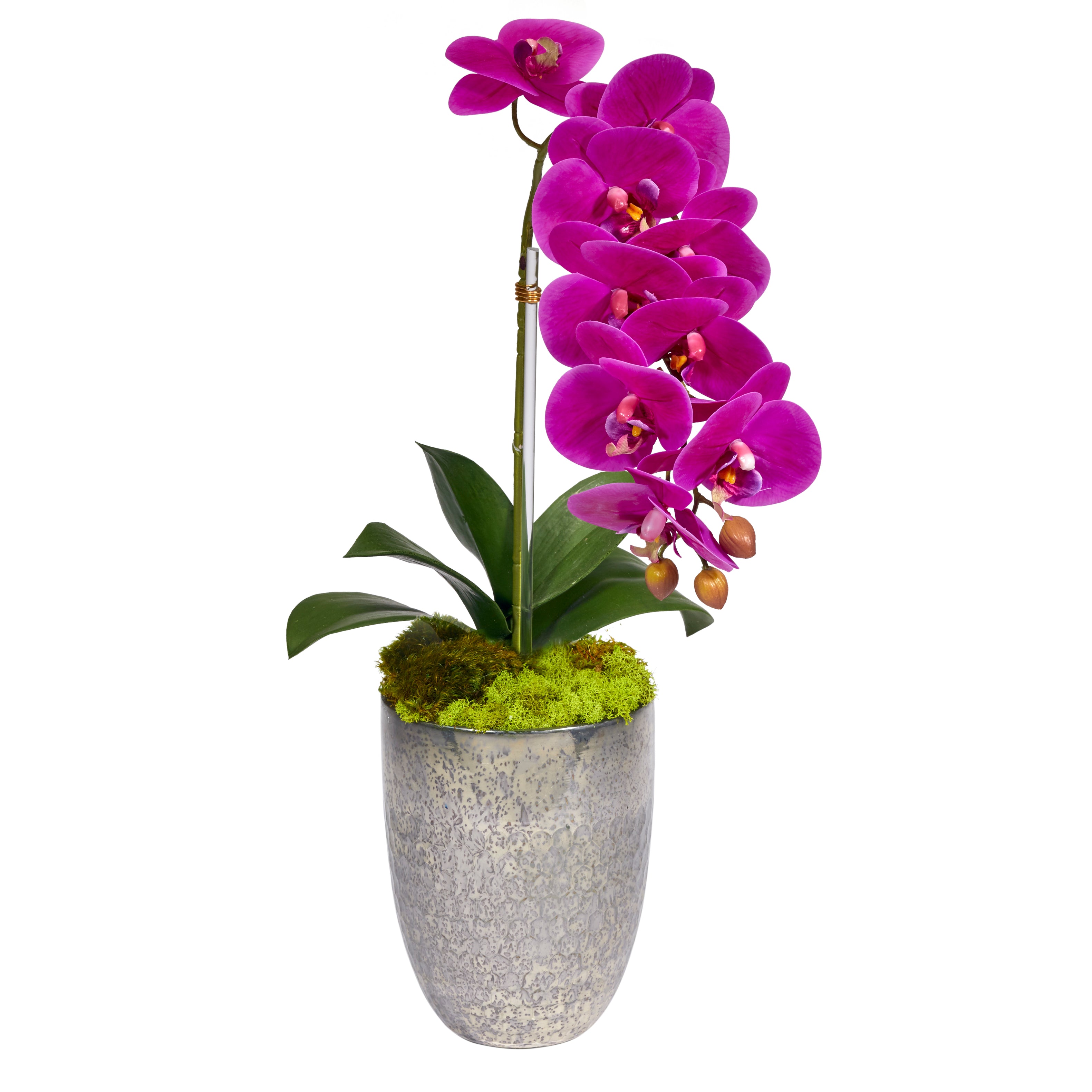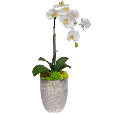 This single Phalaenopsis Orchid fits perfectly into a silver vase, finished with a bed of preserved moss.
